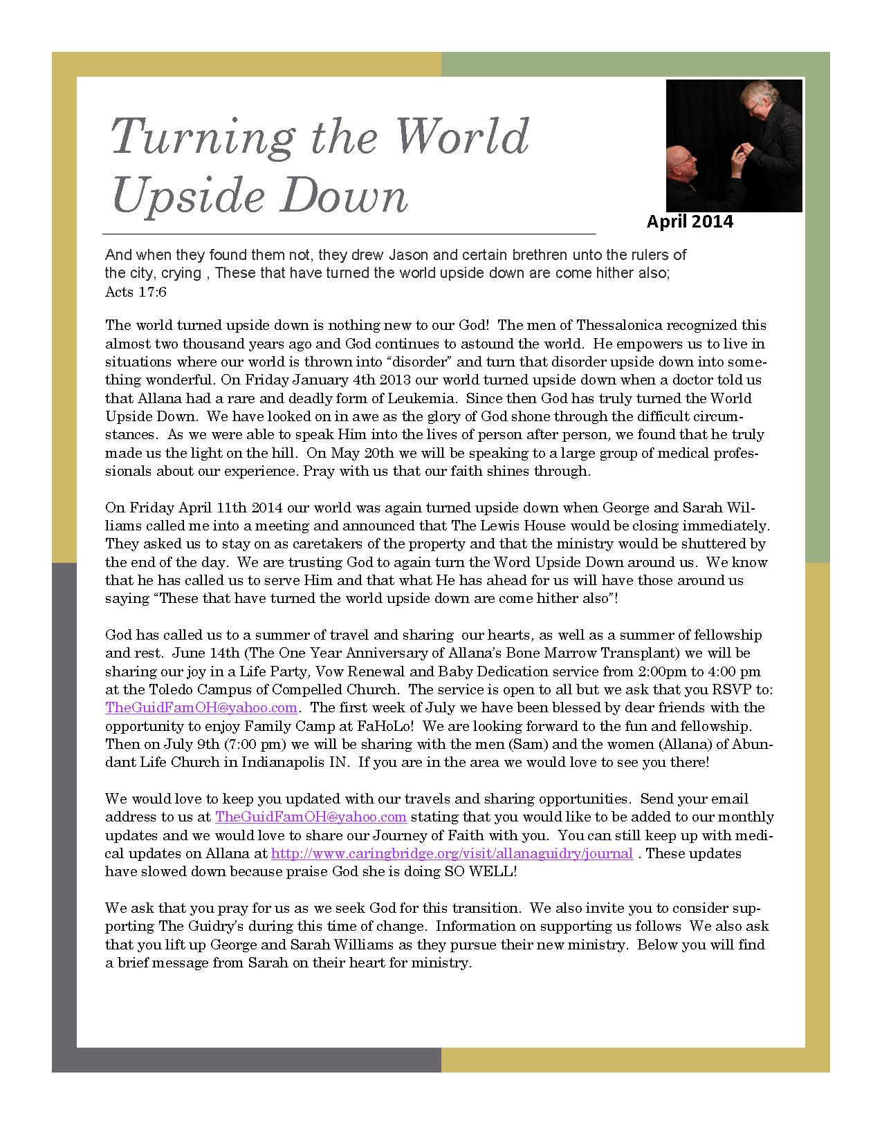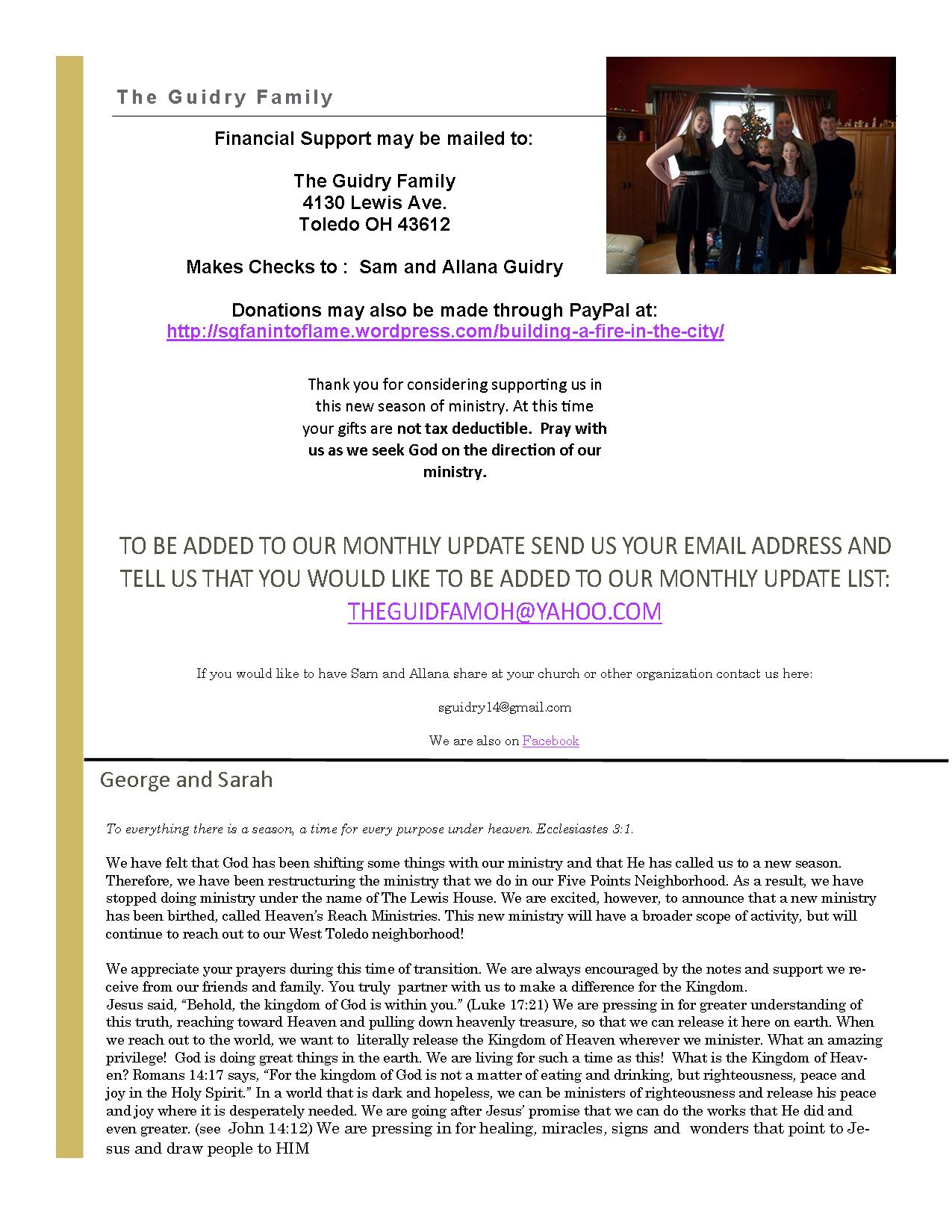Posted in Life and Ministry, tagged Allana Guidry, faith, family, leukemia, love, Ministry, miracles, missions, Pray, prayer, Sam Guidry, service, summer, support, The Lewis House, Toledo, transformation on April 24, 2014| Leave a Comment »